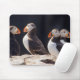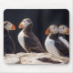 Photograph of 4 puffins looking in opposite directions on rocks at Farne islands, Northumberland.