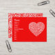 A business card with an attractive flocked floral heart design drawn red on white. The back shows a detail of the flower drawing.