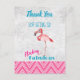 A party thank you postcard with a graphic illustration of a pink flamingo. Text says: Thank you for being so Flocking Fabulous.