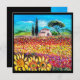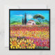 Tuscany landscape,vibrant,expressive beauty of Italian countryside and colourful flower fields in bright yellow orange,pink,fuchsia,purple,red,green,black colours,beautiful Summer meadows,flowers,cypress and olive trees,rustic old farm house under the blue sky.Acrylic painting on canvas .