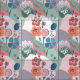An abstract floral pattern in muted shades of pink, orange, blue, green and purple.
