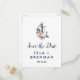 This floral anchor summer save the date postcard is perfect for a nautical wedding. The design features a beautiful bouquet of blush pink and white summer flowers wrapped around a watercolor boat anchor.