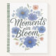 Elegant blue and pink flowers arranged around stylised cursive text reading “Moments in Bloom” with soft watercolor detailing and a transparent black background