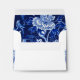 "Floral Asian Influence Navy Blue Chinoiserie RSVP envelope with return address, floral and bird pattern in navy blue and white inside." Elegant, hand painted artwork by internationally licensed artist, Audrey Jeanne Roberts, copyright.