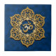 A bright yellow Aum symbol sits inside of a stylised lotus flower. The circular pattern is highlighted to create a light shine on the surface which sits on a deep blue background. Six elegant leaves reach out from the centre of the design to create a beautiful symmetrical pattern. This unique tile design is a striking representation of this spiritual symbol.