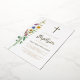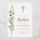 This floral Baptism gold foil invitation features wildflowers and a cross with stylish gold script typography.