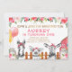 Sweet barnyard or farm themed birthday invitation with removable faux gold heading. This design features some pink flower header and four cute farm animals, some balloons and barn. Perfect for a farmyard, barnyard or farm themed girls birthday party.