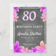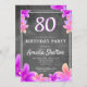 Floral Purple Pink Bellflowers Chalkboard 80th Birthday Party Invitation. This summer flowers 80th birthday invitation is perfect for a midsummer birthday party. Floral invitation template features pink and purple bellflowers on a dark grey chalkboard texture. Personalise the invitation with your data and change or erase any text on the card.