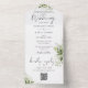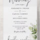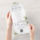 All in one wedding invitation featuring parents' names, botanical greenery rustic leaves, and elegant typography. The invitation includes a perforated RSVP card featuring a QR code. Designed by Thisisnotme©