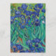 This floral invitation has as a background a irises painting by Van Gogh (now in the public domain).. The text is in a transparent white rectangle.. The occasion "Wedding" and the names are written in a blue elegant calligraphic script, the rest in small black caps.