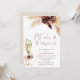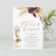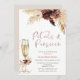 Bohemian inspired bridal shower invitation featuring a lovely dry floral and pampas grass arrangement in natural tones and with some pampas grass. The design also includes a tall glass and dark faux rose gold petals and Prosecco modern calligraphy script heading.