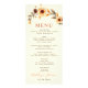 Floral border with peach flowers watercolor style fall wedding budget menu card. Designed for fall weddings, this budget-friendly menu card showcases a beautiful watercolor floral border. The front prominently displays an autumnal arrangement of peach and brown peony-like flowers, accented by pine cones and leaves across the top. A solid peach colour provides a simple, elegant finish on the back.