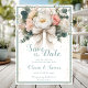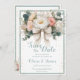 Charming save the date card featuring watercolor flowers, a soft pastel bow, and delicate gold confetti accents. A romantic and timeless design to share your special wedding day announcement with elegance.