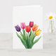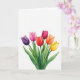 Designed with a watercolor-style bouquet of six closed flower buds rising from the lower edge on a bright white background, this card keeps the focus on simple natural beauty 🌷. The buds fan outward in a gentle arc, as if leaning towards one another like close friends sharing a quiet moment. Colours move across the blooms from deep purple and soft fuchsia to scarlet, crimson, tangerine, and golden yellow, with translucent washes that make each petal look softly layered. Slender green stems and leafy clusters in varied shades of green add depth and a grounded, garden-fresh feel. The generous open space around the bouquet gives the scene room to breathe, like an unspoken pause between two people who understand each other. A short greeting sits near the top in a light grey tone, leaving the flowers to carry most of the attention 🐇. The leaves show small, darker green brush marks along their edges and veins.