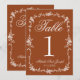 Classy and elegant botanical floral white and burnt orange wedding table numbers. As you see it features a rust old money background with white script that match the whole suite. And white outline floral frame.
