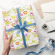 Everyday spring patterned wrap ideal for birthdays or other occasions. Wrapping paper in a bright fresh lime yellow green and white featuring pretty flowers butterflies and hearts in purple pink and spring green yellows . Uniquely designed pattern by Sarah Trett.