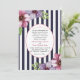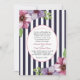 A trendy and elegant invitation with bold navy and white stripes and corner clusters of flowers. In the centre, an oval cameo holds your information topped with a heart element.