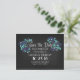 Rustic and modern chalkboard save the date postcards with blue floral bouquets, daisies, wildflowers and trendy calligraphy script font design.