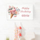 Celebrate in style with this adorable birthday party banner! Featuring a floral ice cream cone with a pink scoop and redberry on top. Perfect for your girl's birthday. Simple, sweet, cool, and fun!