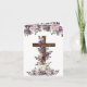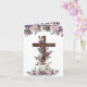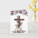 This Easter card features a graphic of a cross adorned with purple flowers with a lamb laying at the base. There is a scripture verse on the inside left. There are pink and purple rosed along the top. The inside has a greeting reads "He is Risen" "Happy Resurrection Day. You can personalise with your names.