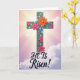 This design shows a tall, stylized cross centered on the card, with a textured, almost carved look that gives it depth. Bright pink and warm orange flowers cluster along the cross, their layered petals suggesting a gentle, affectionate embrace, while smaller teal floral shapes add a friendly, companion-like touch. Soft light-blue dots and accents sit around the blossoms, like little notes of celebration, with a 🌷 tucked into the springlike feel. Behind it, the sky fades from golden pink near the top into a calm lavender lower down, with thin clouds drifting across. Light rays spread from behind the upper part of the cross, forming a soft halo effect that draws your eye upward. Near the bottom, the words “HE IS Risen!” are placed in large lettering, set in a dark ink that stands out clearly against the lighter background 🐰. The cross rests on a deep gray-brown base that looks slightly grainy, with the teal details and pale blue circles scattered around it.
