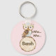Sweet girl's owl themed key ring featuring a watercolor owl wearing a floral crown and a wood slice. Great for a personalized gift.
