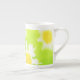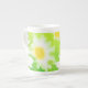 A pretty floral bone china mug with a white daisy flower design against a bright green background.