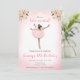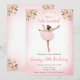 A beautiful ballerina with dark hair and dark skin in a pink tutu. In the corners are pink floral flowers and gold confetti.