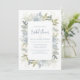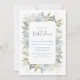 This design features botanical floral greenery rose garden, with a QR code website Facebook event, scannable scan URL social media, chic elegant bridal shower flowers, gift registry register dusty blue, green leaves foliage babies breath, simple minimalist calligraphy script, stylish trendy whimsical typography font, simplistic elegance for her bride, wedding bridal shower party invitation
