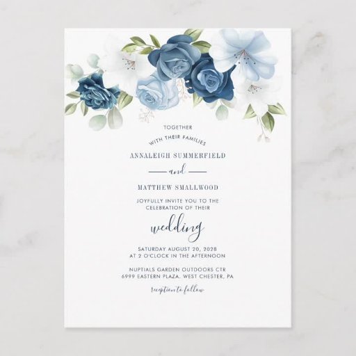 Customise this wedding rehearsal dinner invitation card by clicking the "Personalise" button above. The card features a modern elegant chic dusty blue flowers with white, light blue, and olive green bloom. TIP: Matching wedding suite cards like RSVP, wedding programs, banners, tapestry, gift tags, signs, and other wedding keepsakes and goodies are available in the collection below featuring this design.