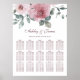 Floral dusty pink rose wedding seating chart with elegant handwritten script calligraphy and classic typography, and a stylish touch of watercolor painted roses in a lush pink and burgundy colour palette on a white background. Exclusively designed for you by Happy Dolphin Studio.