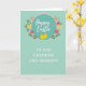 Designed with a circular badge near the top, this Easter greeting card features a thin pink ring around a soft teal center where the words “Happy Easter” appear in flowing white lettering. Around the circle, a loose wreath of simple spring botanicals wraps in a friendly embrace, with pink and yellow blossoms, green leaves, and small orange curls that feel like they’re reaching toward one another 🌷. Two small yellow egg shapes sit tucked at the bottom of the circle, side by side like a cozy pair. The background is a smooth mint green that keeps everything calm and airy, letting the colors mingle gently. Beneath the main artwork, the message “TO OUR GRANDMA AND GRANDPA” is set in white, all-cap letters centered across the lower area. The spacing between the top greeting and the lower message leaves room for the eye to travel, like a quiet pause between loved ones. Tiny leaf tips and petal shapes curve around the wreath, and the eggs rest just under the teal circle like little suns 🐰.
