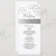 Elegant, modern boho, rustic, chic black and white wedding program with vintage silver floral lace and string lights.