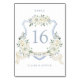 Floral Elegant Dusty Blue Wedding Crest Table Number. Elegant White Flowers and Greenery Wedding Crest Table Numbers