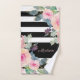 Beautiful pink watercolor floral on black and white rugby striped hand towel. Personalised with your name in an elegant script font.
