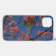 The original floral artwork on this Case-Mate iPhone 13 Case was created from an original photograph by ZoeSPEAK of a flowering tropical tree. The tree has thin black branches which form a linear pattern across the background. There are very few leaves on the tree, but there are plenty of tiny flowers in pompom clusters on all of the branches. The photo was taken looking up into the branches, with the sky as the background. In this version, the background is bright sky blue, and the flowers are shades of pink. The design has a canvas texture overall.