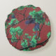 The abstract floral design on this Round Throw Pillow was created from an original photograph by HomeWare of a flowering tropical tree. The tree has thin black branches which form a linear pattern across the background. There are very few leaves on the tree, but there are plenty of tiny flowers in pompom clusters on all of the branches. The photo was taken looking up into the branches, with the sky as the background. In this version, the background is terracotta red, and the flowers are light green. The design has a canvas texture overall.