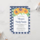 It is decorated with watercolor sunflowers and foliage in shades of yellow and green on a blue gingham background.