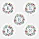Floral framed monogram clothing labels in greys, blues, yellow and pink on a white background.