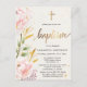 Invite your family and friends to celebrate Baptism of your daughter with these trendy watercolor floral invitation postcard featuring gold and pink flowers and gold script 'Baptism'.