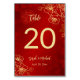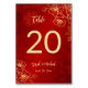 This Chinese wedding table number cards features beautiful gold line art flowers and a red double happiness symbol on a shimmering ruby red background.