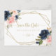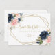 This floral gold geometric horizontal save the date postcard is perfect for a rustic wedding. The design features beautiful hand-painted dark blue, blue, navy, pink , blush, gold flowers and green foliage, bunched into elegant bouquets, adorning a geometric frame.