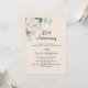 A soft beige, linen background. Decorated with a white floral, peony flower and green watercolored eucalyptus greenery. Personalise and add your names and the details