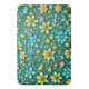 A vibrant pattern of stylised yellow and blue flowers is set against a rich teal background. Various shades of green leaves complement the colourful blooms creating a harmonious and decorative design.