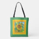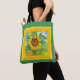 A bright and cheery floral design for a handy tote bag! A large sunflower bordered in yellow and orange, on a coordinating green background. A variety of styles and sizes to choose from.