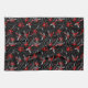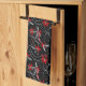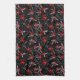 This kitchen towel is shown in a lovely black and red floral print design.