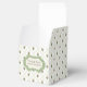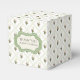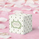 Pretty green, ivory and white wedding favour gift box with a lattice pattern, with colourful flowers. A green and ivory decorative plaque, on the front of the box, has custom dark brown text ready to personalise to read what you want.