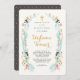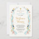 Beautiful wildflower-inspired Baptism invitation with a frame made up of blue laurels, pink wildflowers and gold accents. The delicate hand painted sprigs surround your text announcing your special day- with a cross at the top of the frame. In beautiful blues, pinks, golds and browns with birch wood grain on the reverse side.