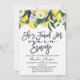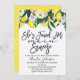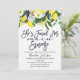 White floral and lemons bridal shower invitation featuring a brush calligraphy heading in black and a lemon fruit and floral wreath. The back of the invitation is a yellow watercolor wash image with a small white dot pattern. This is a sweet design and a lovely way to invite guests to a bridal shower.