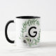 This coffee mug features a clean floral leaf design surrounding a bold letter G initial, creating a simple and elegant look for everyday use. The design is printed in high resolution on a durable ceramic mug with a smooth surface and comfortable handle.